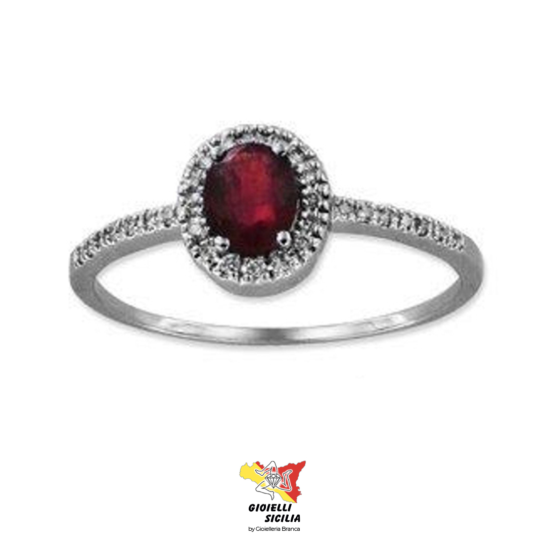 Modello solitario con contorno con rubino centrale incastonato con griff a 4 denti