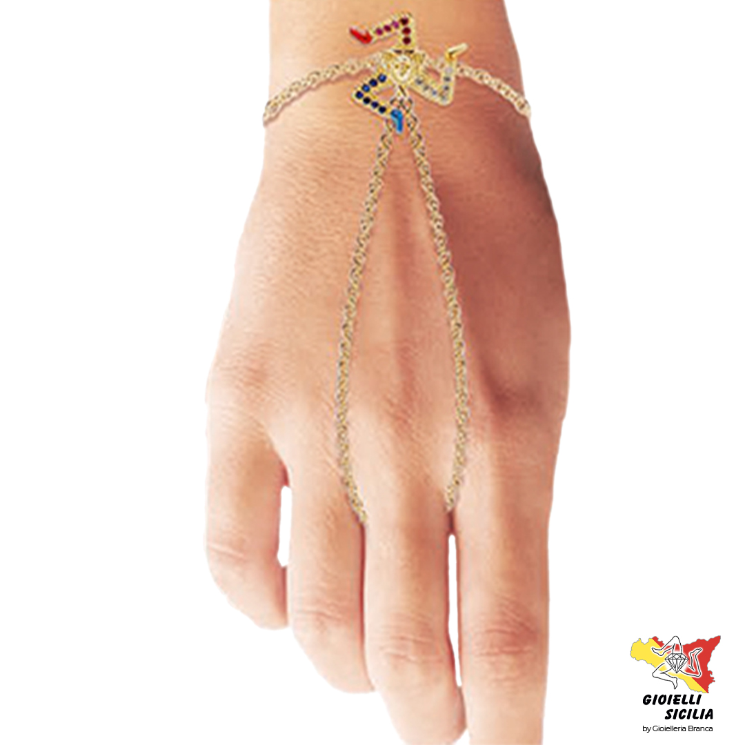 Il baciamano MY SICILY, in Argento 925 con una pregiata finitura PVD oro giallo, è un gioiello che esprime tutta la passione, l’eleganza e l’identità della tradizione siciliana. Il suo design esclusivo è impreziosito da un raffinato motivo centrale che rappresenta la Sicilia, ornato da cristalli Swarovski rossi, bianchi e blu, un connubio cromatico ricco di luce, intensità e carattere.