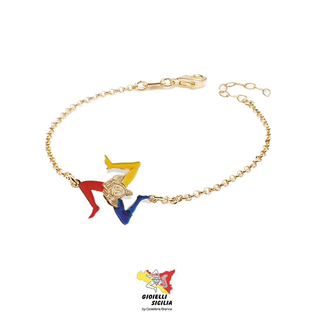 Bracciale MY SICILY in Argento 925‰ con finitura PVD Oro Giallo, un omaggio colorato e simbolico alla Sicilia. Il motivo centrale è la Trinacria, con testa e tre gambe piegate, smaltata nei colori giallo, rosso e blu che rappresentano rispettivamente la Sicilia e il suo mare profondo.