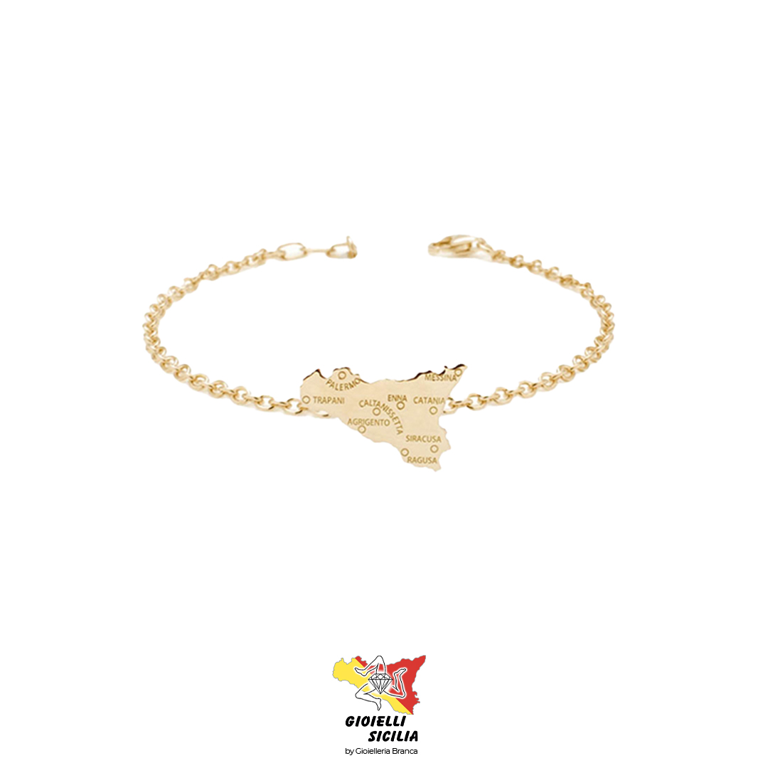 Il bracciale My Sicily in Argento 925 con finitura in PVD oro giallo è un omaggio raffinato e intenso alla geografia e all’identità dell’isola di Sicilia. Il motivo centrale raffigura la sagoma dell’isola in una versione dettagliata, impreziosita dall’incisione delle province siciliane direttamente sulla superficie: un piccolo capolavoro che trasforma il gioiello in una mappa simbolica da indossare.