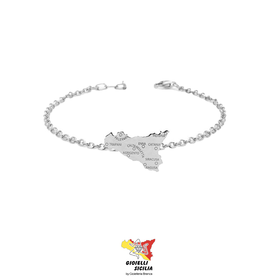Il bracciale My Sicily in Argento 925 con finitura in PVD Rodio è un omaggio raffinato e profondo alla cultura e al territorio siciliano. Il suo elemento centrale è la sagoma dell’isola, arricchita da una finissima incisione che riporta le province siciliane, trasformando questo gioiello in una vera e propria mappa simbolica, carica di significato e appartenenza.