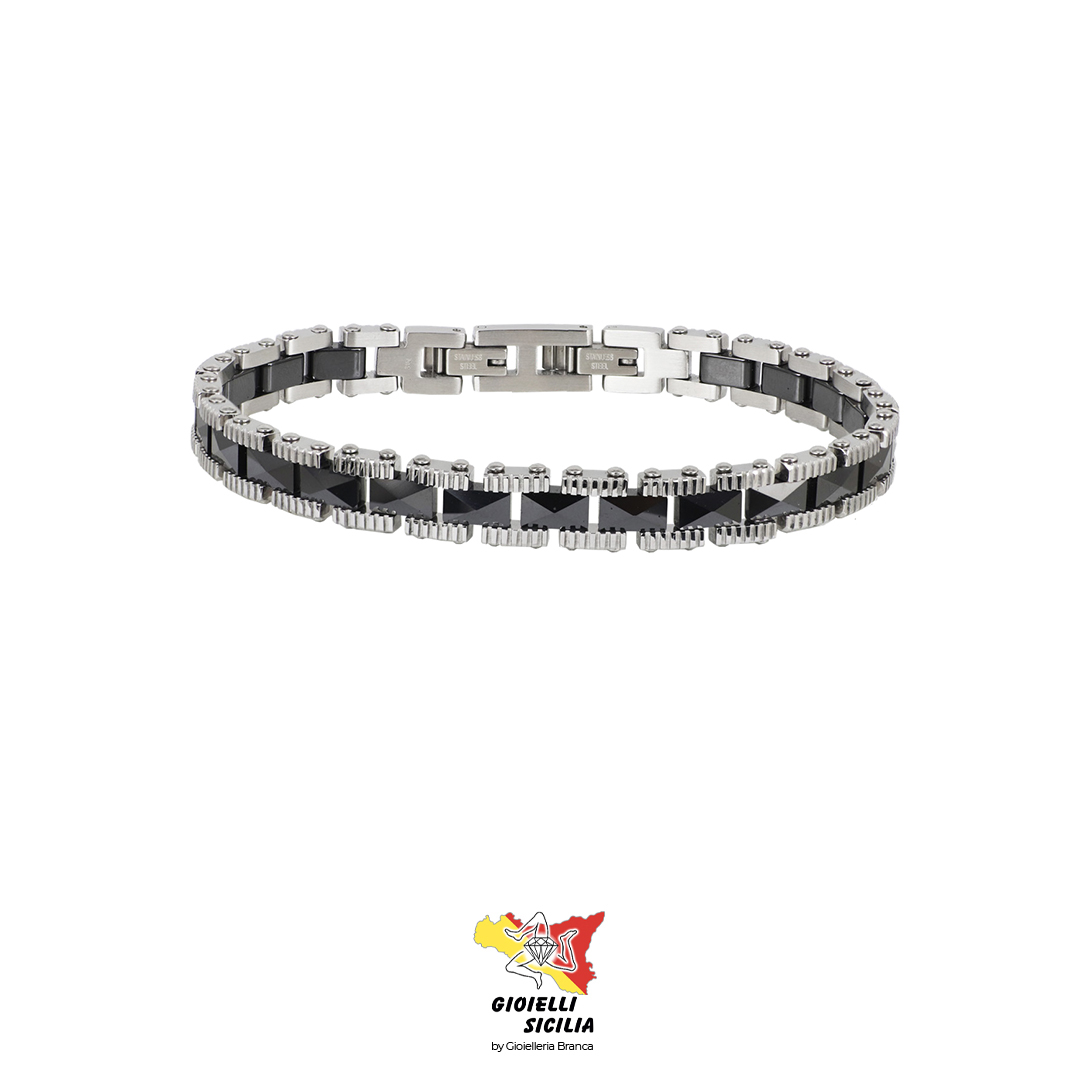 Formato da tante maglie in Ceramica nera effetto 3D collegate tra loro da perni in Acciaio