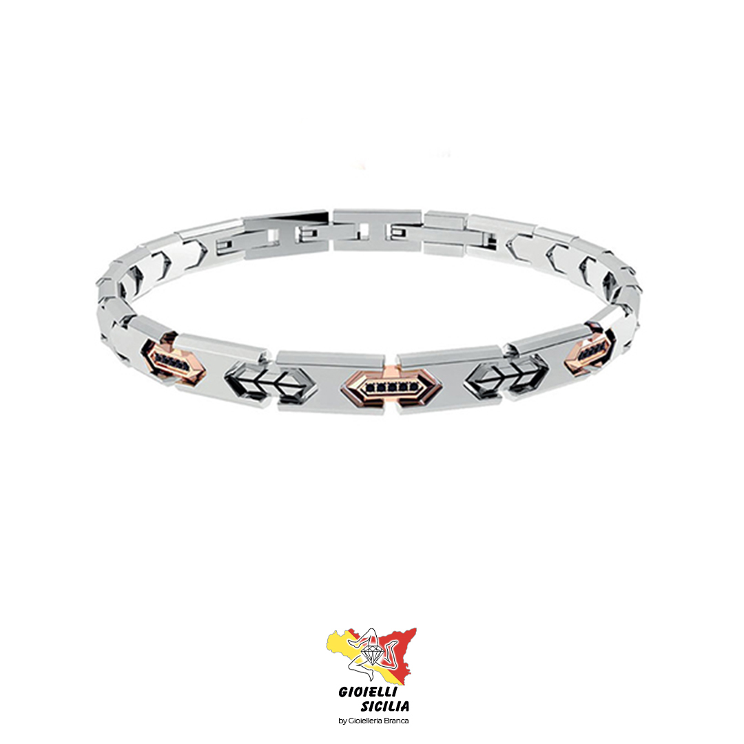 Formato da una maglie in Acciaio PVD rodio con congiunzioni in PVD oro rosa e oro giallo