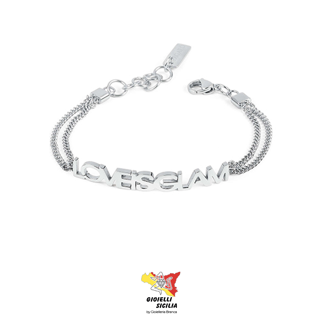 Il bracciale è arricchito al centro dalla scritta “LOVE IS GLAM”