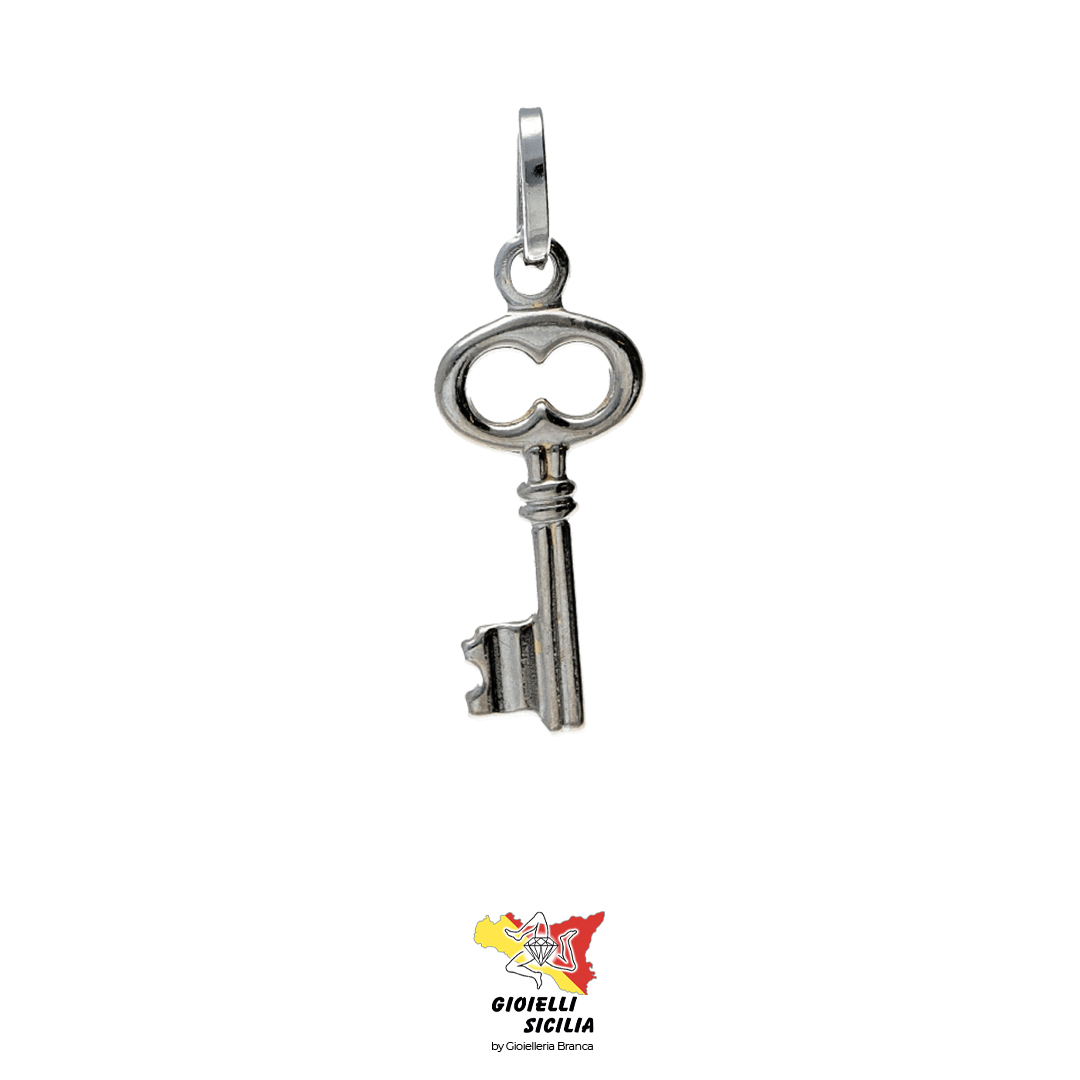 Ciondolo realizzato in Oro Bianco 18Kt 750°/oo, formato da una Chiave, sempre presente nella gioielleria italiana, con una struttura in Oro Bianco bombata e finitura lucida.