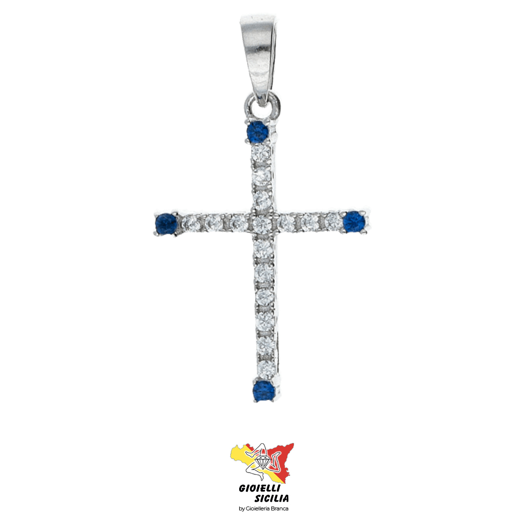 Ciondolo/Croce DONNA in Oro Bianco 18 Kt. 750°/oo con Zirconi Bianchi e Blu