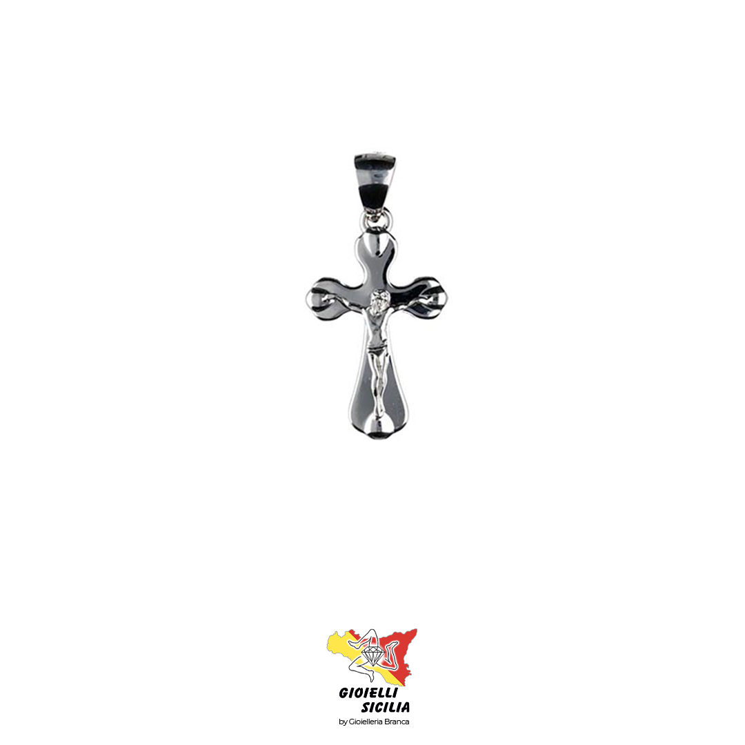 Ciondolo realizzato in Oro Bianco 18Kt 750°/oo a forma di croce modello elegante e tondeggiante, con rilievi finali sulle punte.