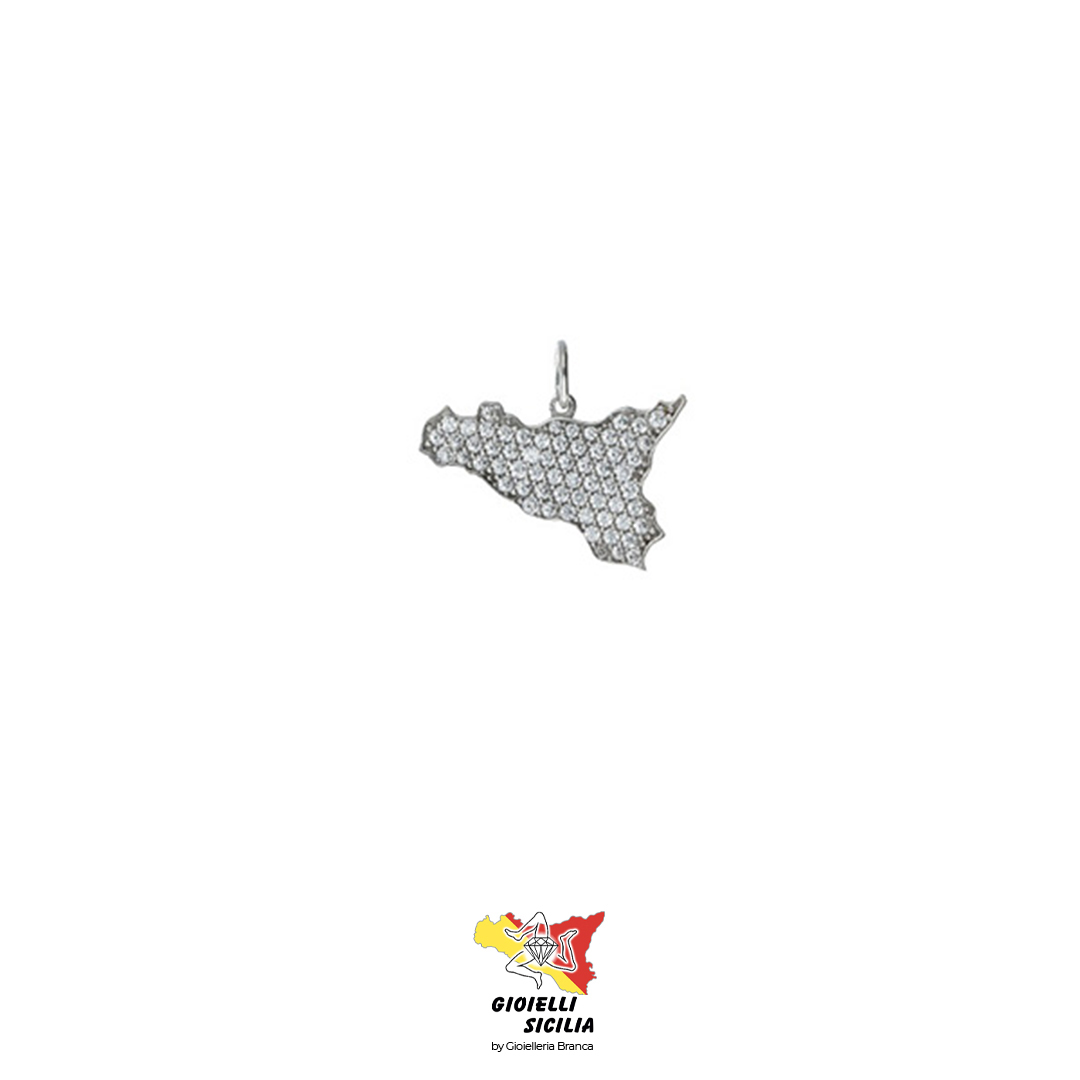 Ciondolo realizzato in Oro Bianco 18Kt 750°/oo, al centro del design si trova la sagoma della Sicilia, impreziosita da un pavé di Swarovski bianchi, rendendo il gioiello ancora più luminoso.
