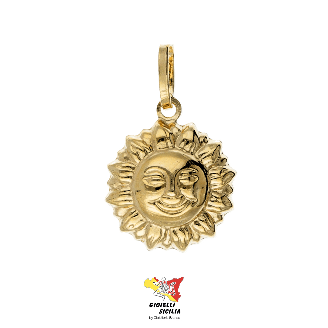 Ciondolo realizzato in Oro Giallo 18Kt 750°/oo, formato da un Sole, la nostra stella, sempre presente nella gioielleria italiana, con una struttura in Oro Giallo di forma intagliata, bombata e lucida. Raffigurato con un volto sorridente. Sole fonte di vita!