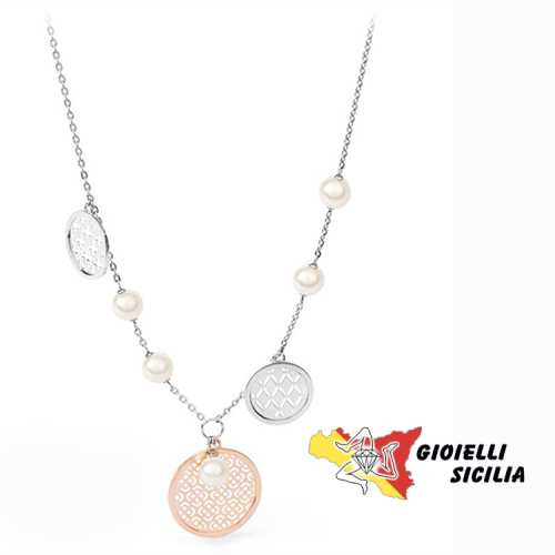 Collana formata da una serie di medaglioni in acciaio e medaglione centrale pendente in PVD oro rosa