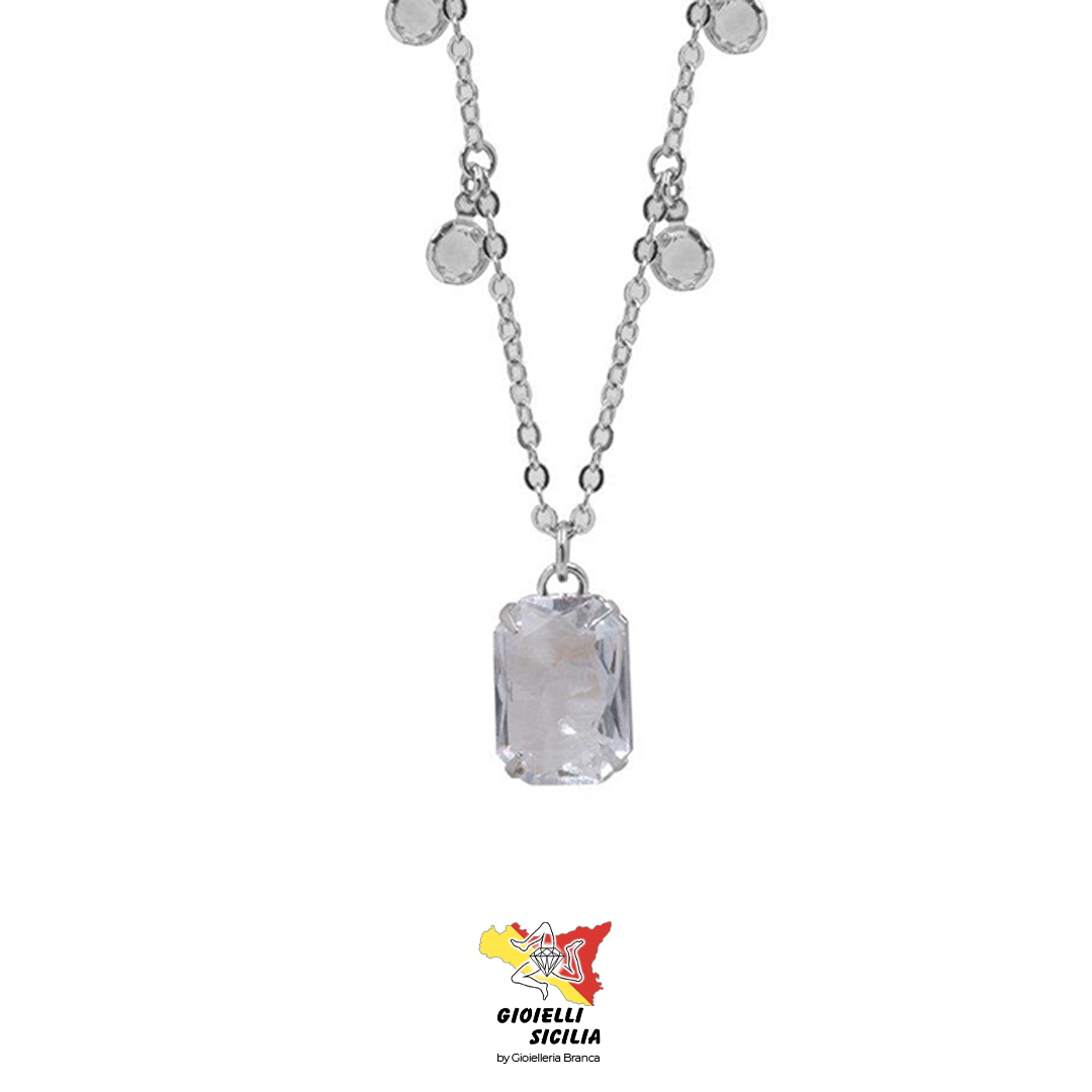Tutti i cristalli sono fissati con griffe a 4 denti, garantendo stabilità e sicurezza nel tempo. La struttura della collana è in PVD rodio, materiale che assicura brillantezza e resistenza. La catena, composta da anelletti ovali, è dotata di chiusura a moschettone con catenella di regolazione, permettendo di adattarne la lunghezza.