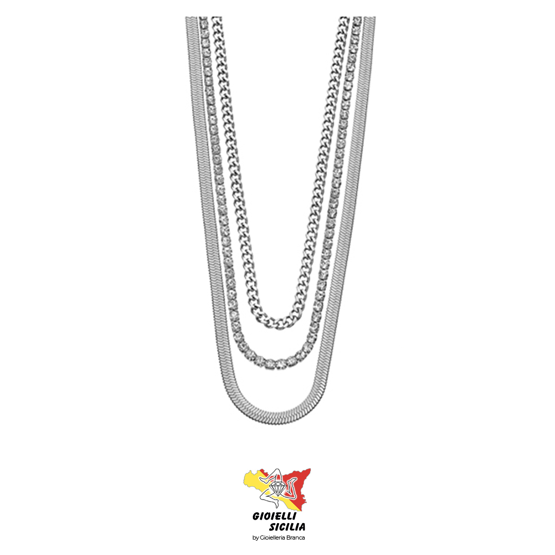 Il filo più corto modello grumetta, il filo di mezzo con cristalli Swarovski, il filo più lungo modello piattina.
