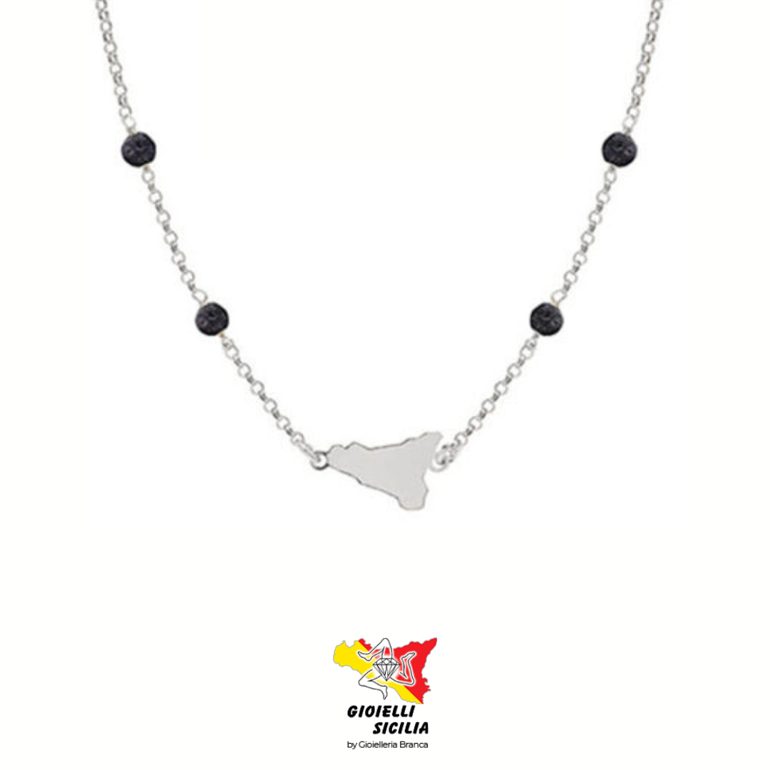 La collana My Sicily in Argento 925 con finitura in PVD rodio è un gioiello essenziale e dal forte valore simbolico, che racchiude l’identità siciliana in una forma sobria ed elegante. Al centro della composizione si trova la sagoma della Sicilia, isola emblematica del Mediterraneo, protagonista assoluta di questa creazione. A impreziosire la catena, quattro palline di pietra lavica, materiale naturale che richiama l’anima vulcanica dell’isola e la sua energia primordiale.