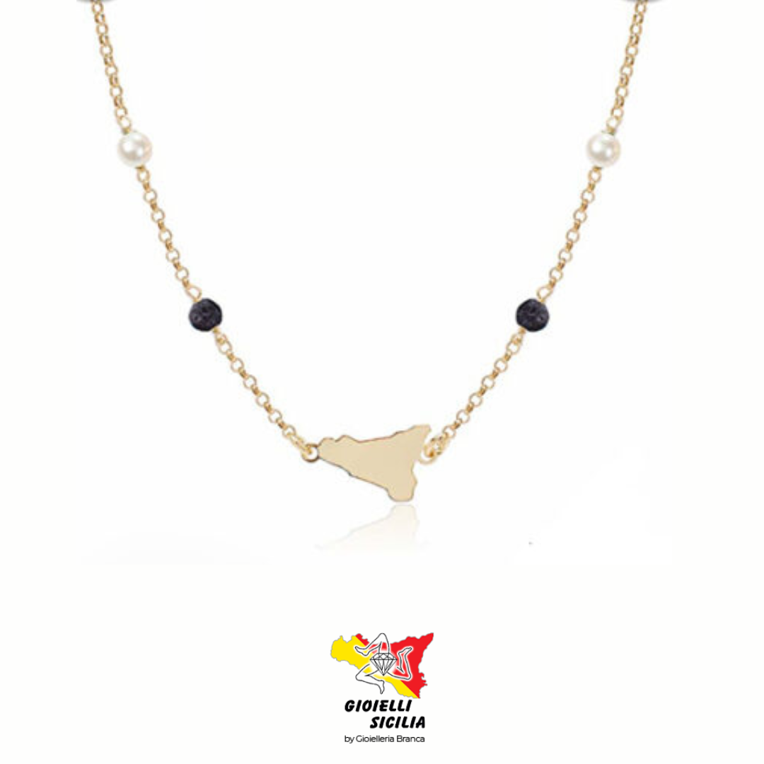Collana MY SICILY con Trinacria Pietra Lavica e Perline PVD Oro giallo