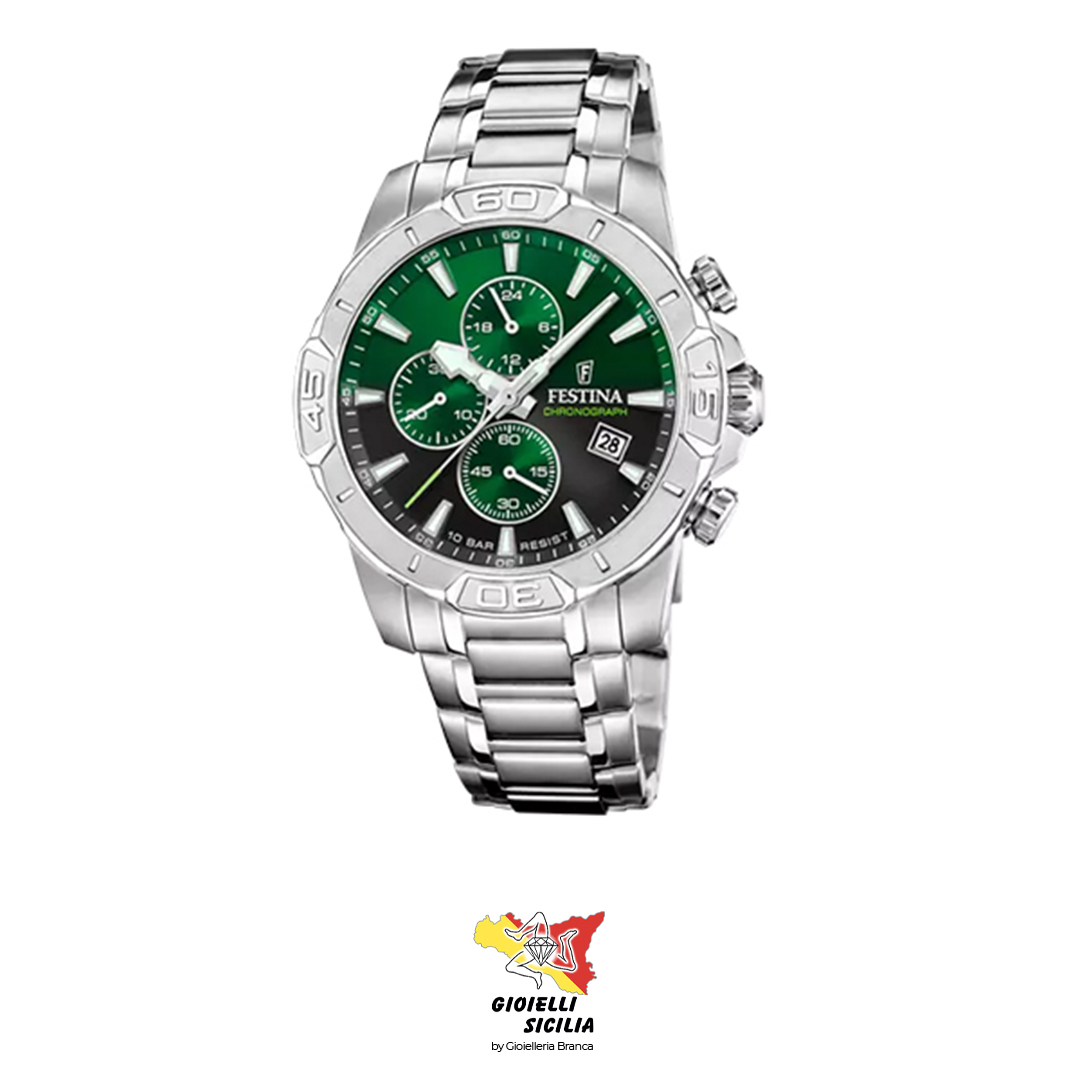 L’orologio FESTINA da uomo combina stile sportivo ed eleganza, offrendo prestazioni e design di alta qualità. Realizzato in acciaio 316L con finitura in PVD Rodio è dotato di un robusto bracciale in acciaio che garantisce comfort e resistenza nel tempo. Il modello cronografo presenta un quadrante verde sfumato nero, impreziosito da indici e lancette fosforescenti per una perfetta leggibilità anche al buio.